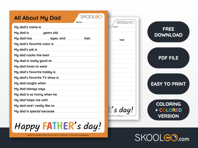 All About My Dad 1 - Free Worksheet - SKOOLGO This activity worksheet shows the beginning of 16 sentences related to a kid's father. The information includes name, age, physical description, personality, job, tastes, hobbies, habits and shared passions. This is a great exercise for children to get to know the members of their family. If they don't have all the information, they can ...
