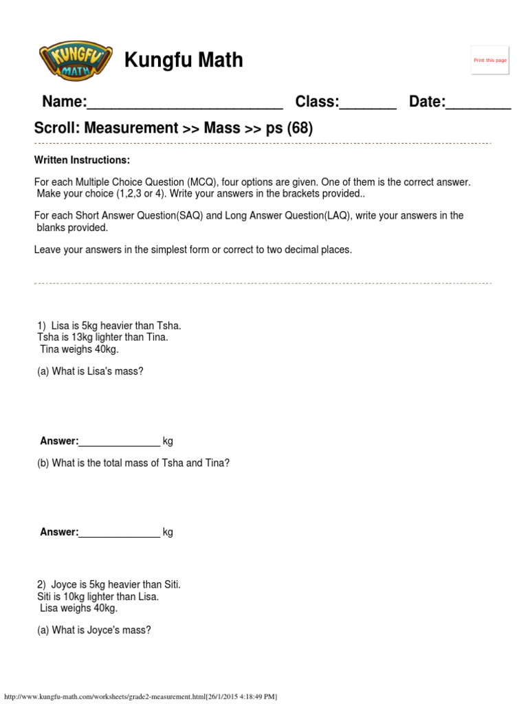 Math worksheets grade 2 mass. IXL | Learn grade 4 math Junior kindergarten Kindergarten Grade 1 Grade 2 Grade 3 Grade 4 Grade 5 Grade 6 Grade 7 Grade 8 Grade 9 Grade 10 Grade 11 Grade 12 Calculus Grade 4 math IXL offers hundreds of grade 4 math skills to explore and learn! 3rd Grade Math Worksheets - Math Salamanders Using these 3rd grade math worksheets will help your child to: round a number to the nearest 10, 100 or 1000; use the > and < symbols correctly for inequalities; use multiples and apply them to solve problems. learn to balance math equations; All the 3rd grade math worksheets below support elementary math benchmarks. 5th Grade free Math Worksheets | Grade 5 Maths Worksheets Curriculum: The Worksheets here are generally suitable for students studying in CBSE/ NCERT/SCERT, ICSE, IB (PYP), Singapore Math, Cambridge Primary, UK National, K12 Common core standards, Australian, New Zealand & all International Curriculum. 2nd Grade Math. Texas Essential Knowledge and Skills (TEKS ... TX. 111.4. Grade 2, Adopted 2012. 2.2. Number and operations. The student applies mathematical process standards to understand how to represent and compare whole numbers, the relative position and magnitude of whole numbers, and relationships within the numeration system related to place value. The student is expected to: